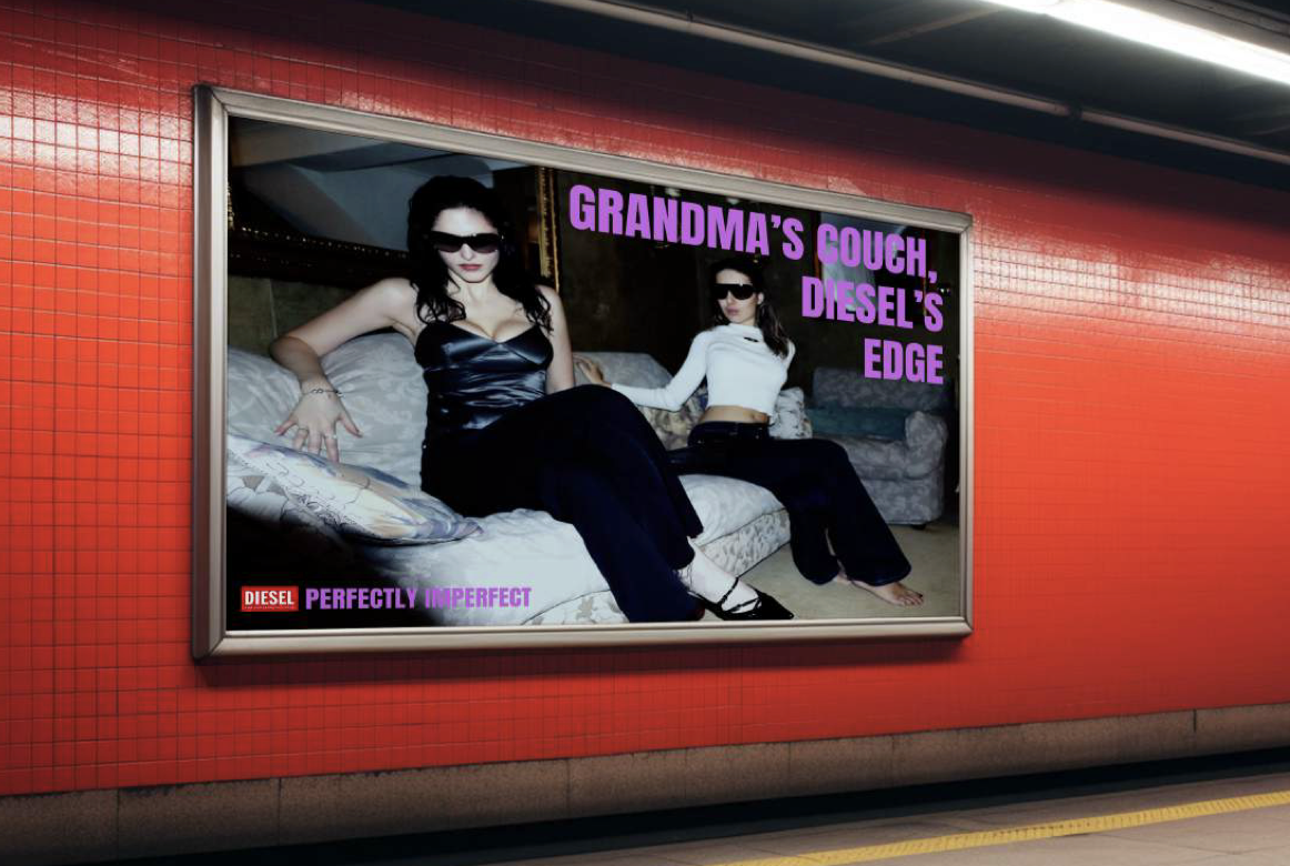Perfectly Imperfect by Diesel challenges the societal obsession with perfection by using contradictions: polished models, raw denim, unconventional poses, and imperfect everyday environments (e.g., “grandma’s couch”, casual chaos, urban nightlife). Through bold slogans and high-impact visuals, Diesel denim becomes a symbol of unapologetic self-expression.