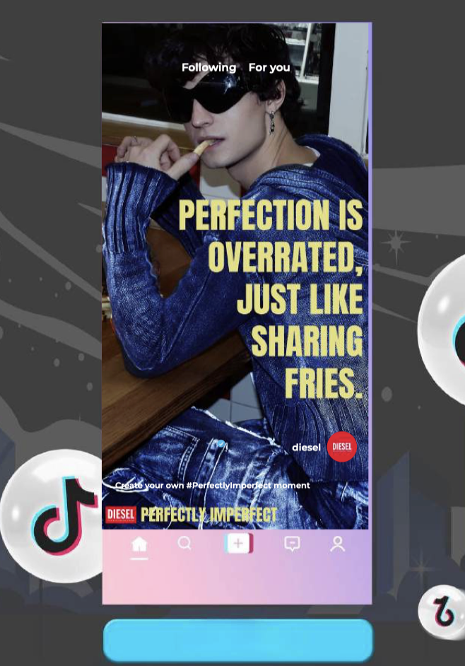 Developed for Instagram and TikTok, the social media outputs enable direct audience engagement and participatory storytelling, allowing Diesel’s community to actively interact with and extend the “Perfectly Imperfect” campaign narrative through platform-native, shareable content.