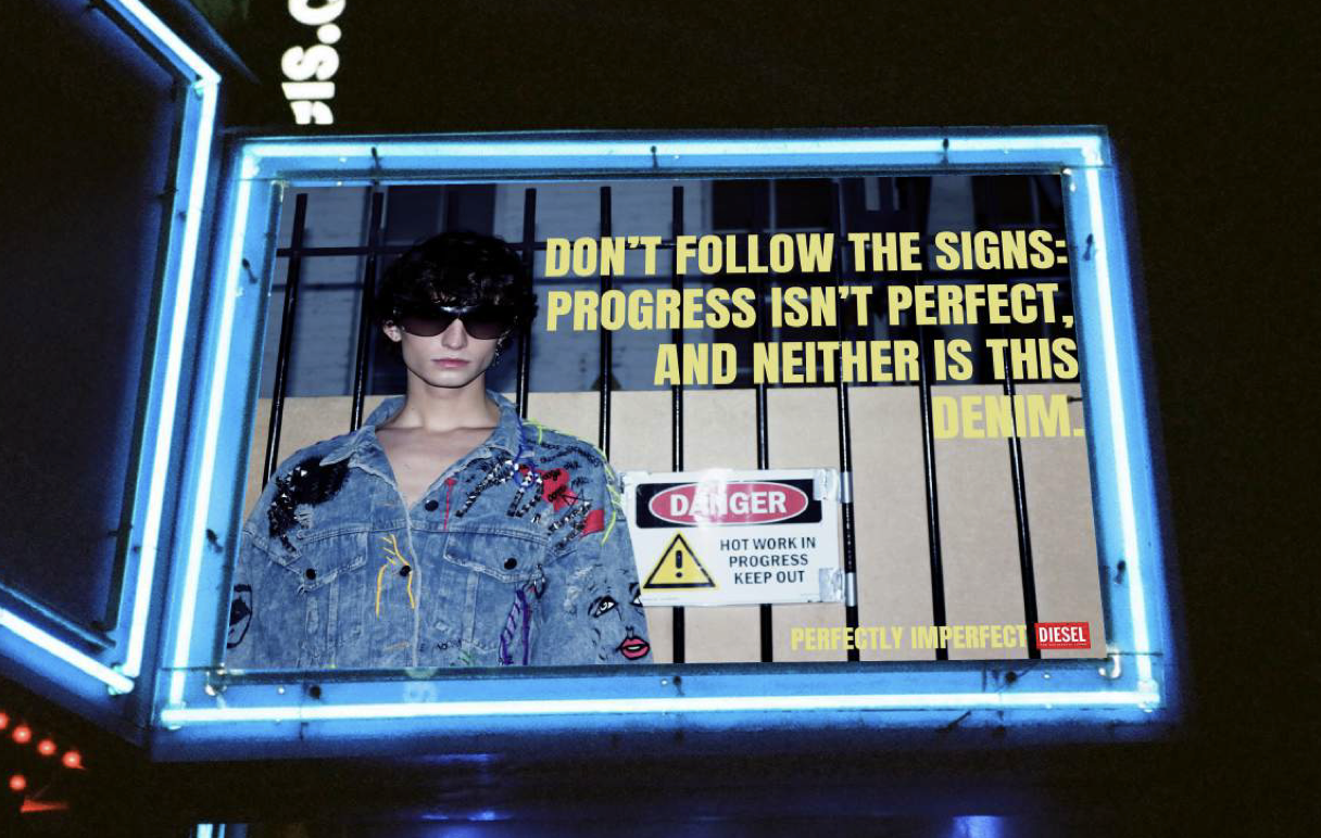 Designed for high-visibility urban placements, the billboard uses bold slogans and raw composition to disrupt polished fashion advertising and reinforce Diesel’s anti-perfection positioning.